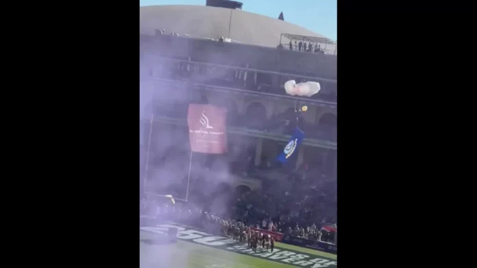 The Lockheed Martin Armed Forces Bowl game in Fort Worth, Texas was off to an exciting start on Friday as Texas State faced off against Rice. The pregame festivities were filled with adrenaline-pumping moments, including fighter jets soaring through the sky and parachutists gracefully floating into the stadium. However, one parachutist’s landing did not go as planned, resulting in a viral moment that had everyone talking.