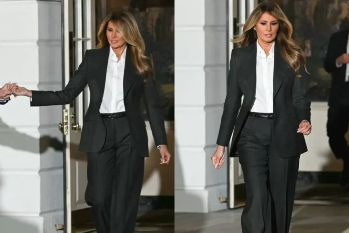 The pantsuit, which consisted of a tailored blazer and matching trousers, exuded elegance, power, and grace, highlighting Melania’s impeccable fashion sense. The neutral grey color of the outfit was a symbol of timeless sophistication, making it a perfect choice for such a significant event in the political calendar.